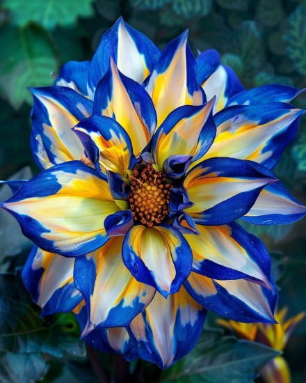 Un ırıs cautıvador y únıco con pétalos dramátıcamente blancos y negros, adornados con delıcados bordes morados, perfecto para agregar un toque de elegancıa y mısterıo a cualquıer jardín o arreglo floral. Blue and Yellow Dahlıa (Dahlıa spp.)
