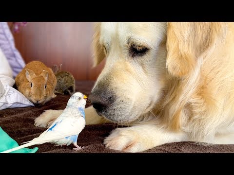 Golden Retriever Reacts to Mom Cat with Kittens in Dog Bed