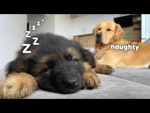 Golden Retriever Dog Teaches Sassy English Cream Puppy How to Climb Stairs for the First Time
